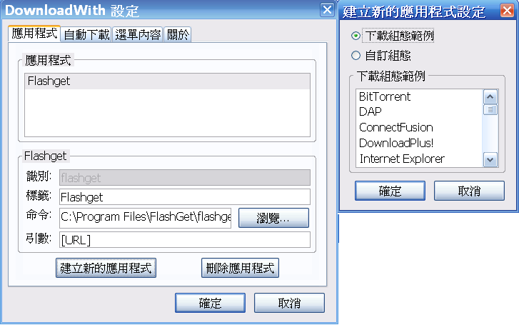 DownloadWith是一個免費的 Mozilla/Firefox 擴充套件, 它可以經由數種不同的外部續傳軟體來下載檔案. 它跟Flashgot最大不同的地方就是它不像Flashgot一樣可以一次下載整個網頁的檔案,但它可以指定續傳軟體的位置和自動下載. 找個自己順手的來用吧:wink: