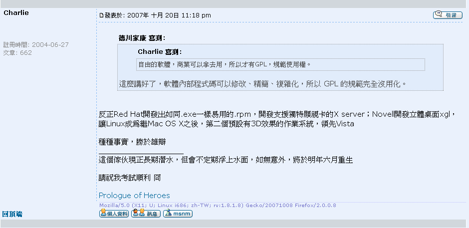 Mozilla/5.0 (X11; U; Linux i686; zh-TW; rv:1.8.1.8) Gecko/20071008 Firefox/2.0.0.8