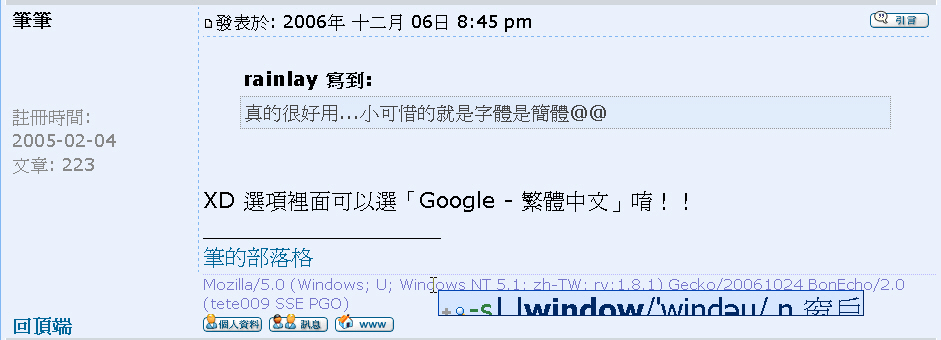 Mozilla/5.0 (Windows; U; Windows NT 5.1; zh-TW; rv:1.8.1) Gecko/20061024 BonEcho/2.0 (tete009 SSE PGO)