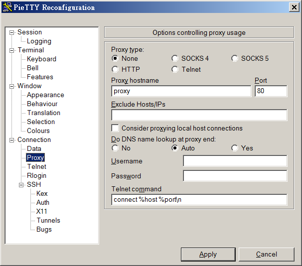 檔案註釋: Pietty 的代理伺服器設定畫面