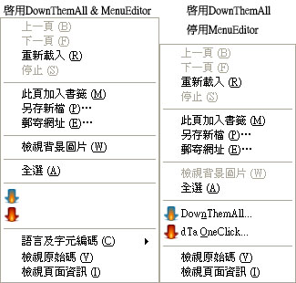 可是, 下圖卻顯示出其不完善之處, Menu Editor將down them all的右鍵功能攬來做了, 可是Menu Editor在自己的資料庫裡找不出相應要顯示的字串, 只得留下空格