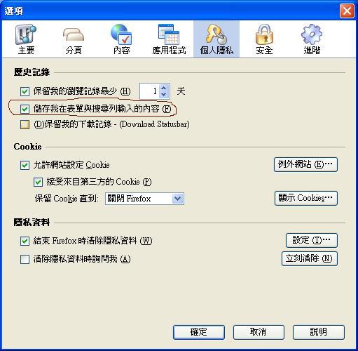 Firefox 有一個很好用的功能:「儲存我在表單與搜尋列輸入的內容」。