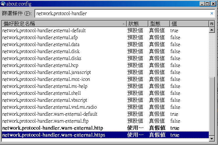 但是以 network.protocol-handler 篩選,可以找到一堆選項,捲動到最下面