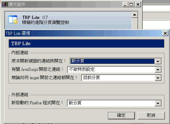 最後一點,Firefox 可強制新視窗開原先的分頁或新的分頁裏,但它沒有更細的設定,因此如果我希望 target="_blank" 這類的連結開在「目前分頁」,而 javascript 視窗開在「新分頁」,Firefox 就辦不到。但舊版 TBP 的程式碼卻提供了這個功能。