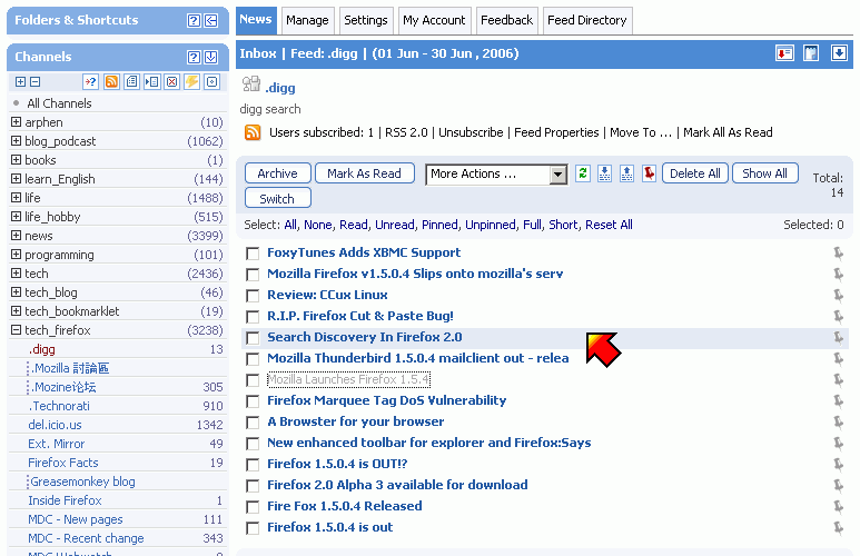 2. 可區別已讀過和未讀過的文章 (這對我來說很重要,Sage和bloglines似乎都不行)