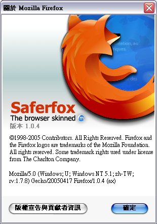 Mozilla/5.0 (Windows; U; Windows NT 5.1; zh-TW; rv:1.7.8) Gecko/20050511 Firefox/1.0.4