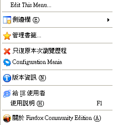實在是好物一枚,但由於自訂的選單必須使用「Menu」這個按鈕才能顯示(用魚型按鈕就只能看到被「MenuEdit」精簡後的)再加上從Compact Menu就有的「只要使用 Menu 按鈕便有些套件的資料便會蹦出至網址列旁(最著名的便是ScrapBook)所以如果能夠將使用「Menu」按鈕或是日後有什麼圖示按鈕能代替「魚型」按鈕讓那些(像 ScrapBook)不該特別出現的物件隱藏起來實為大快人心之一事。