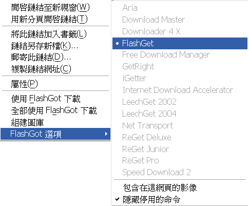 Flashgot 是一個免費的 Mozilla/Firefox 擴充套件, 它可以經由數種不同的外部續傳軟體來下載單一或是多個("全部" 或 "選擇")檔案