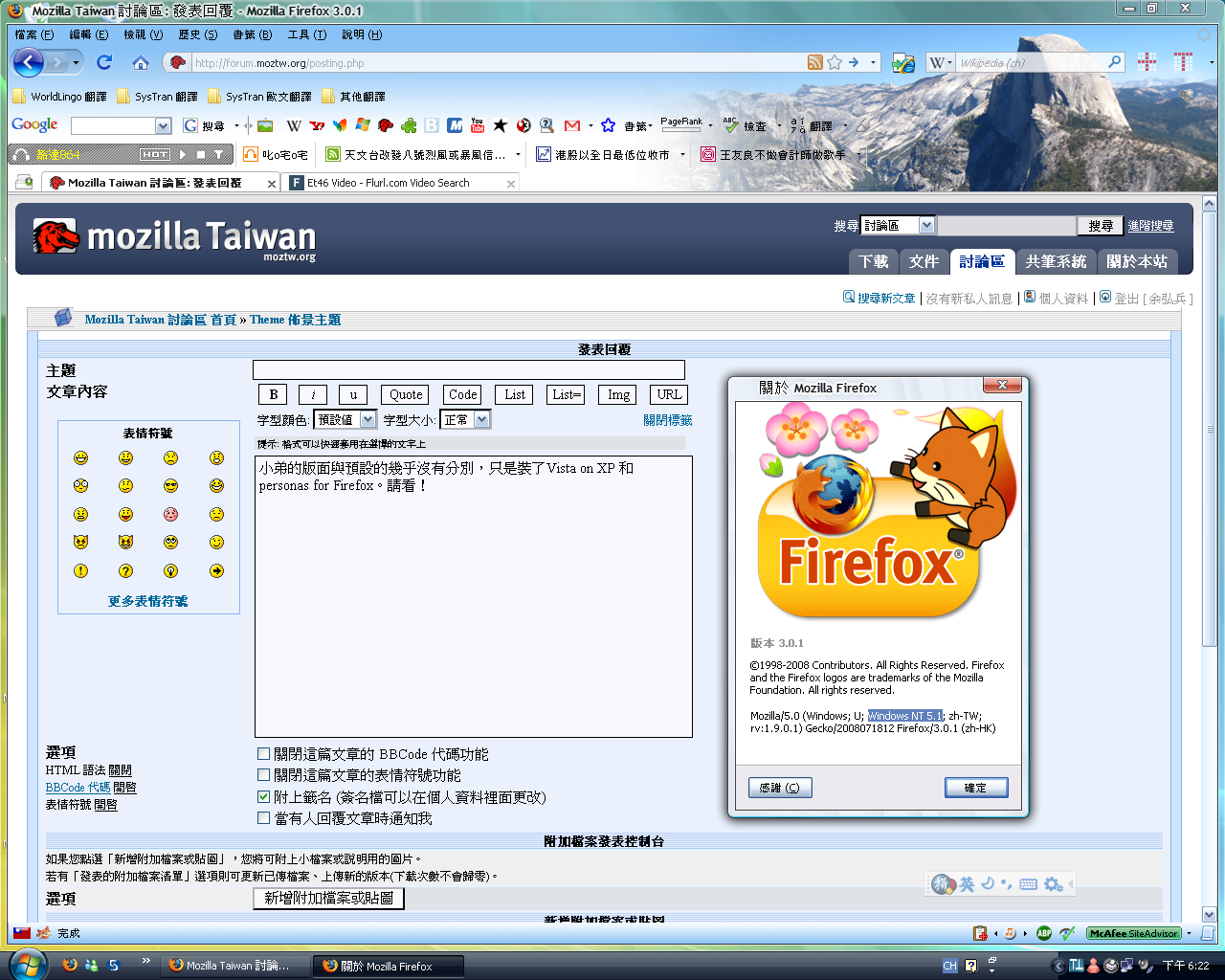 小弟的版面與預設的幾乎沒有分別,只是裝了Vista on XP 和 personas for Firefox。請看!還有,請大家估一下,我用的是XP或Vista?