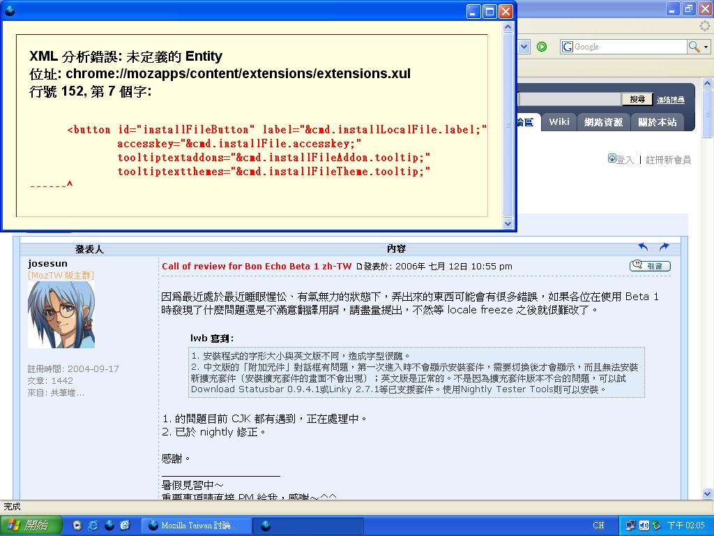 此討論串繼續討論有關 Firefox 2.0 Beta 2 的翻譯問題與回報。