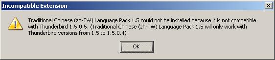 這是相容於Thunderbird 1.5.0.5的正體中文化套件包,包含Linux i686、MacOS、Win32等版本可用。需要的人可自行點選適當版本下載。只要將下載後的套件包依照擴充套件的安裝方式裝上,就可以使用正體中文的Thunderbird了!(安全模式下將被停用)