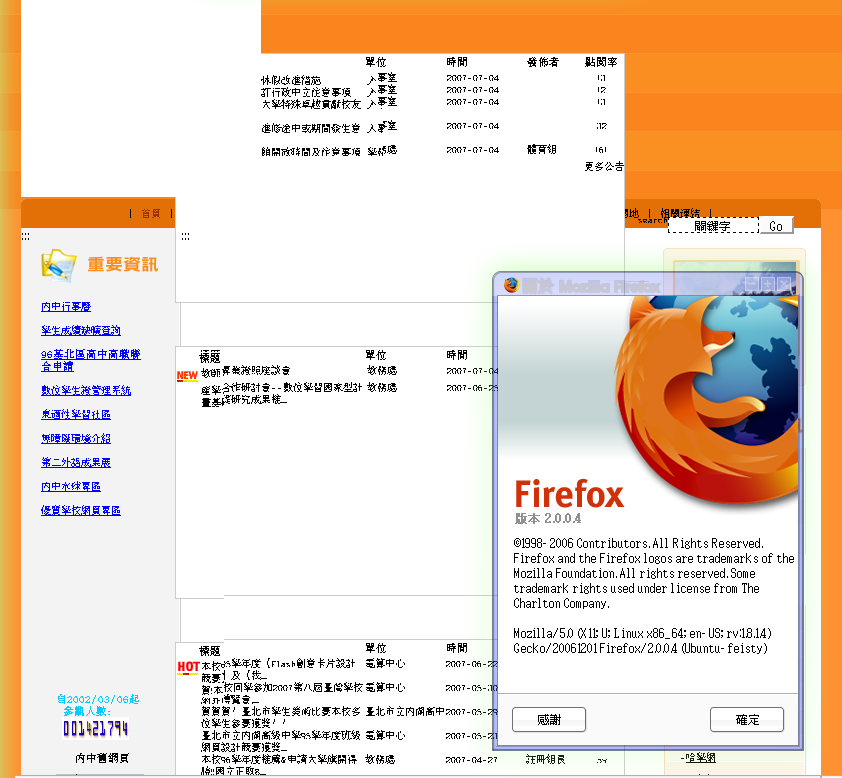 Mozilla/5.0 (Windows; U; Windows NT 5.1; zh-TW; rv:1.8.1.4) Gecko/20070515 ImageShackToolbar/4.2.1 Firefox/2.0.0.4