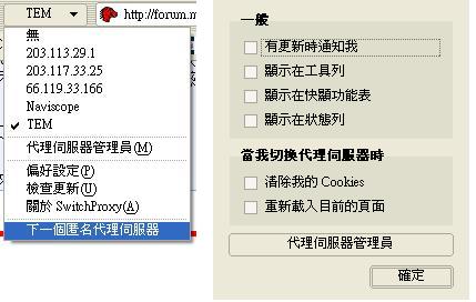 顧名思義就是切換代理伺服器的工具,這個套件之前 sandor 就已經在這裡發佈過了,但是用了一段時間之後,發現裡面有一些東西有些問題,所以稍微整理一下重新發佈;這裡面除了修改 sandor 原有的 locale 之外,原本沒有中文的部份,是參考鮑大人ScrapBook 中文版依樣畫葫蘆而來,謹此致謝~~~~~ m(_ _)m