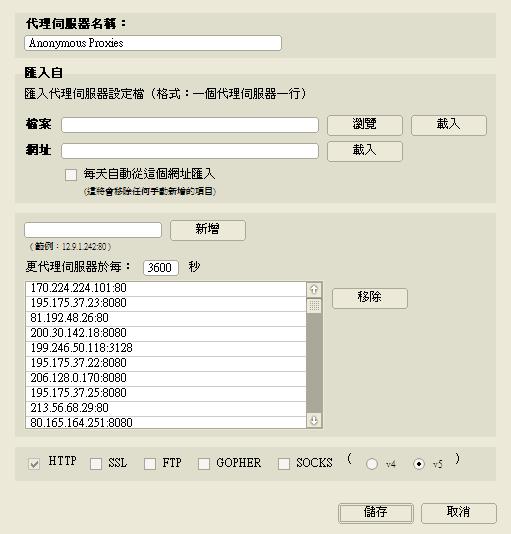 這個套件有一個比較值得一提的功能,就是他可以匯入一個代理伺服器列表,然後定時自動換代理伺服器,相信有此需求的朋友一定很明白我在說什麼。(這裡提供一個自動更新的 Proxy 列表,大家可以試試這個功能)此外對於使用 NB 的馬路戰士們,這更是不可缺少的一項工具,相對於 Maxthon 來說,他切換代理伺服器絕對不會有需要重新啟動瀏覽器的時候,比起來要比 Maxthon 優秀,而且功能較多,相信來自大陸內地的朋友一定對此需求感覺深刻。