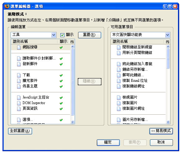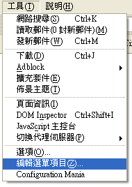 顧名思義這個工具就是拿來編輯 FireFox 的選單用的,相信您可能有過這樣子的經驗:在 FireFox 裝了越來越多的套件之後,忽然發現快顯功能表太長,會跑到螢幕外面去;有時候又覺得選單太亂,常常按錯,像我最常不小心按到「郵寄此XX」,然後 Outlook 便衝了出來~現在有了 Menu Editor,您可以將選單上的項目分門別類,就再也不會發生上面所述的窘況了!