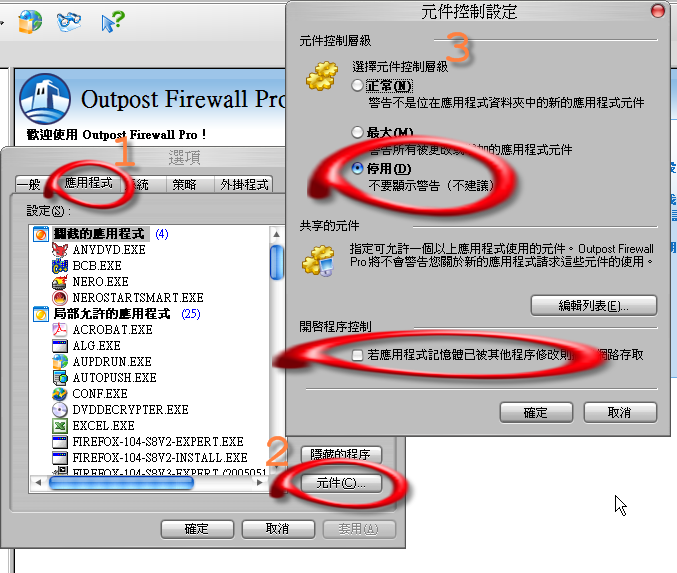 檔案註釋: Output Firewall Pro v2.6 - 選項→應用程式設定→元件